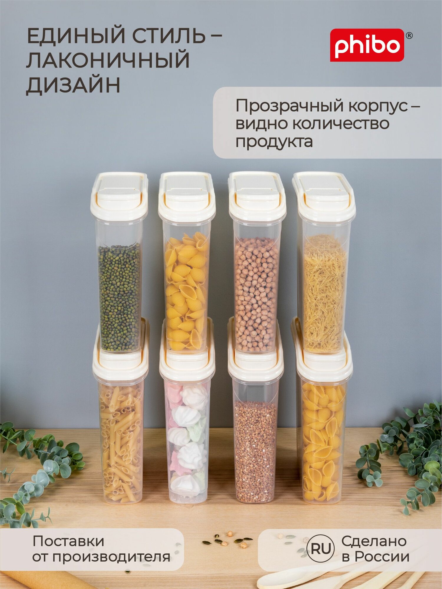Phibo комплект ёмкостей для сыпучих продуктов 8 штук по 2,0л (бежевый флэк) 43428260722