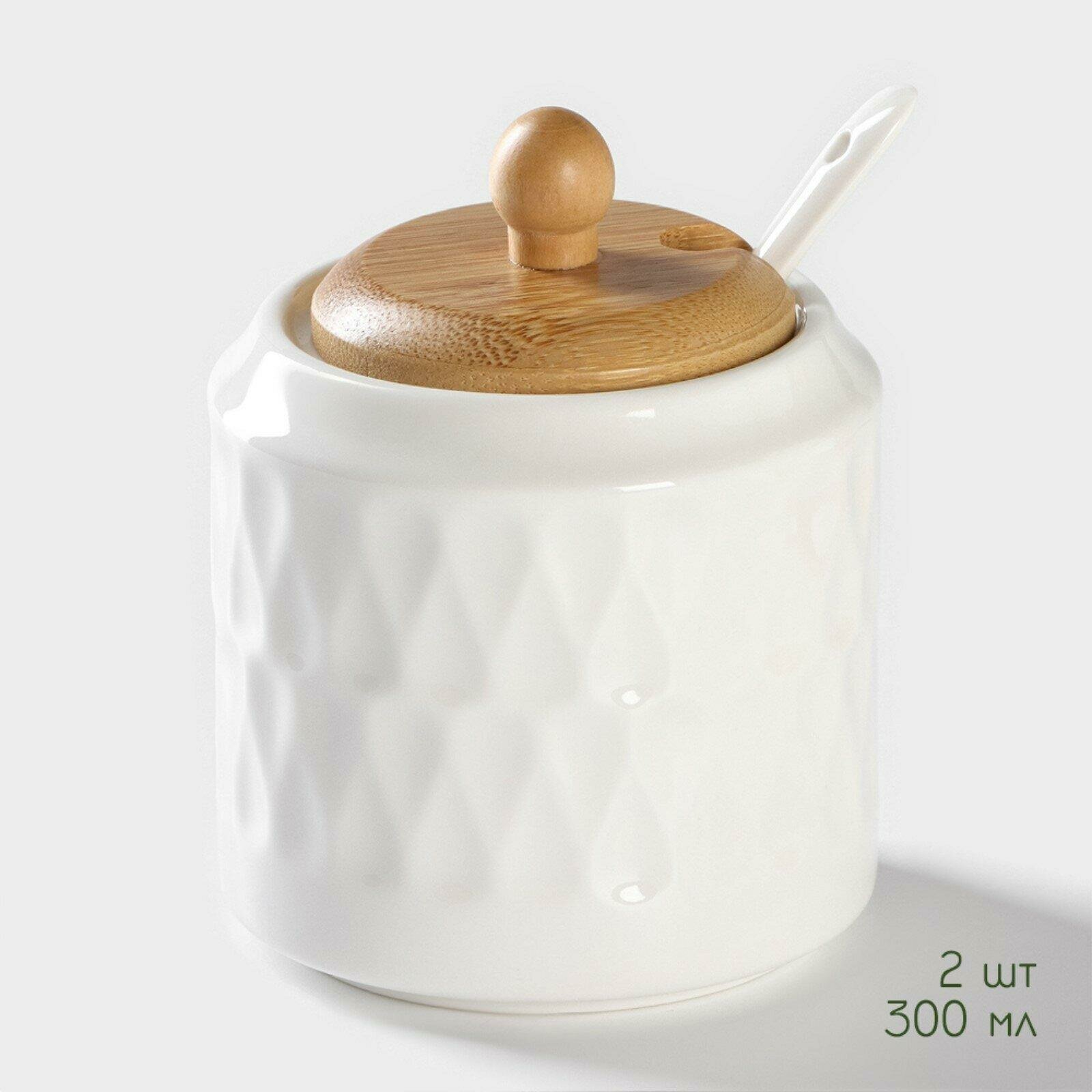 10 цен на Набор банок фарфоровых с ложками на бамбуковой подставке BellaTenero Герда, 300 мл 2 шт, цвет белый