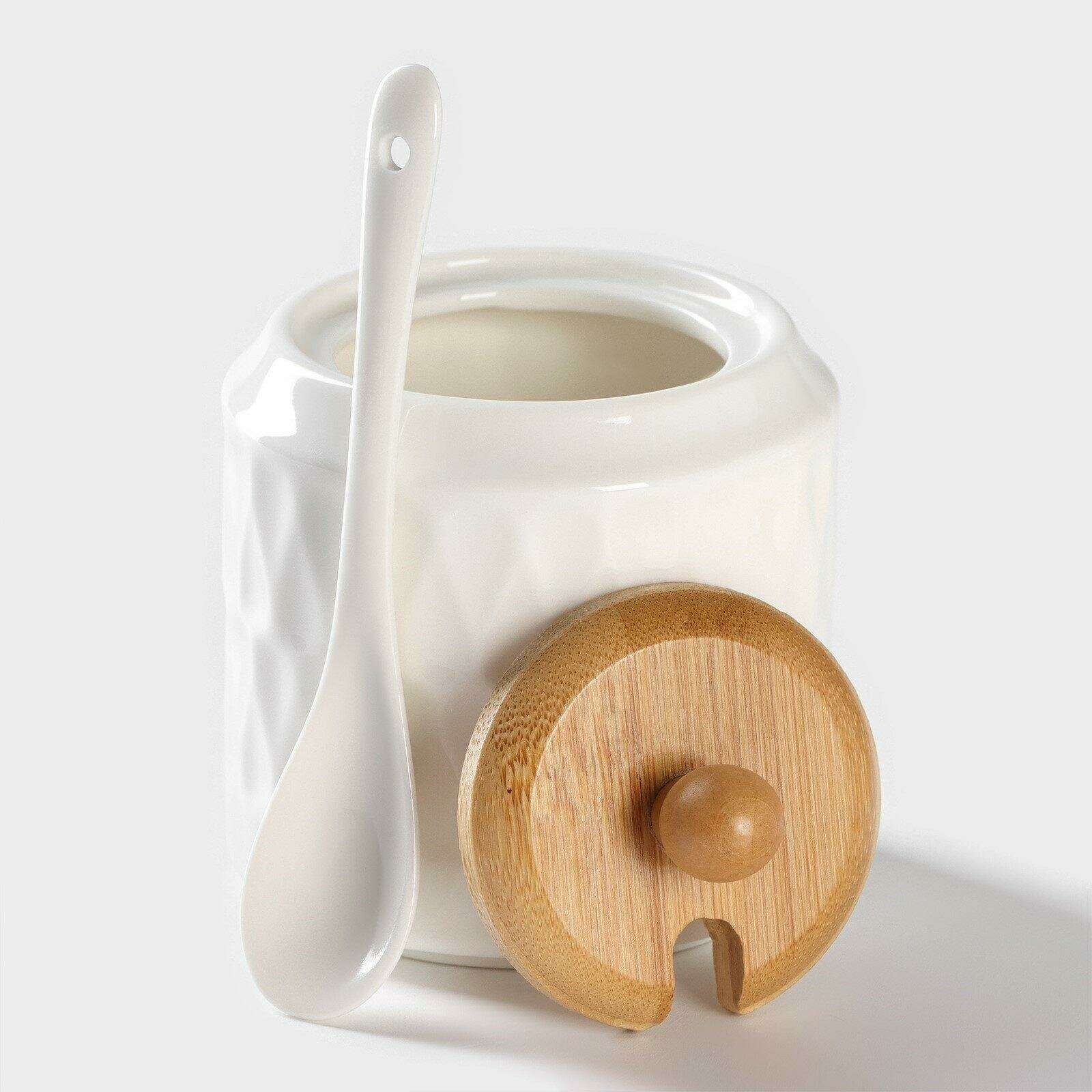 Банка для сыпучих продуктов BellaTenero, 280 мл, 9 9,5 см, с ложкой, бамбуковая крышка, фарфор, белая 724 ₽