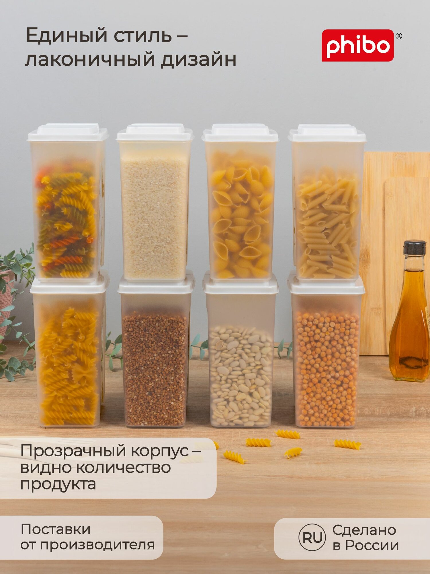 Комплект емкостей для сыпучих продуктов 1,75л 8 шт, (Белый), Phibo информация: