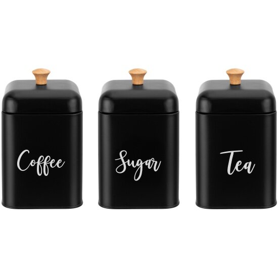 | Дополнительная информация | Набор 3 банок для сыпучих продуктов "Tea, coffee, sugar" с крышками, черный, 11,2х11,2х19 см 1,5 л - каждая, высота без крышки 13,5 см, металл. Не рекомендуется использовать абразивные моющие средства. |