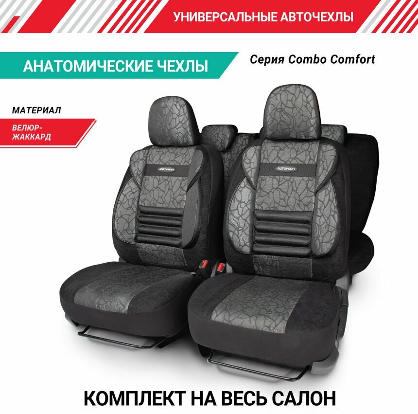 AUTOPROFI CMB-1105 ANTHRACITE Авточехлы COMFORT COMBO, мультиконтурные, поддержка спины + поддержка плеч + поясничный упор. форм. велюр, 11 предм., карман, 6 молний жаккард полипропилен, расцветка "Антрацит", , ,