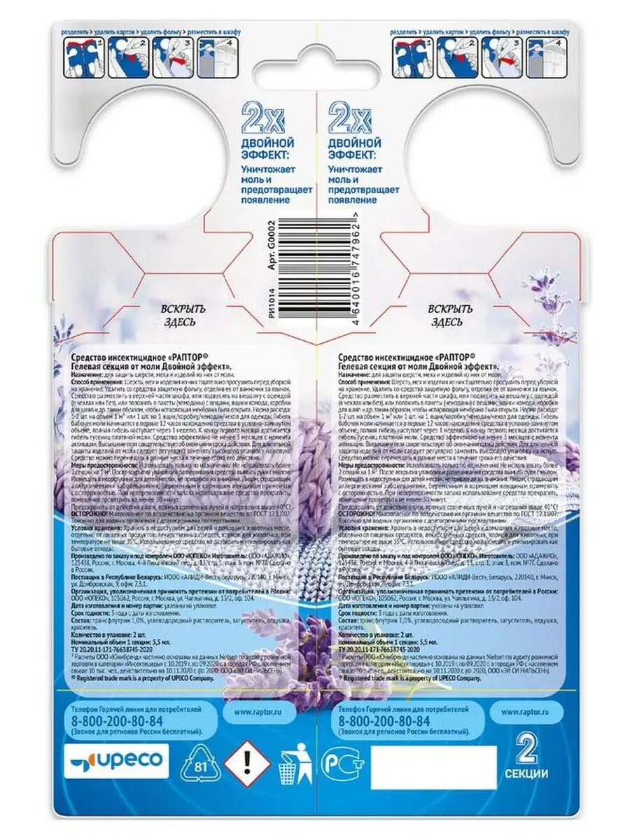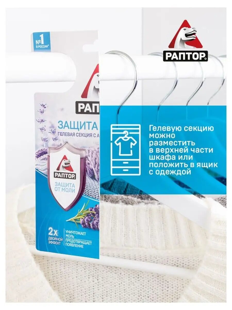 Раптор Гелевая секция от моли с ароматом Лаванды Двойной эффект (2шт) (2уп в наборе)
