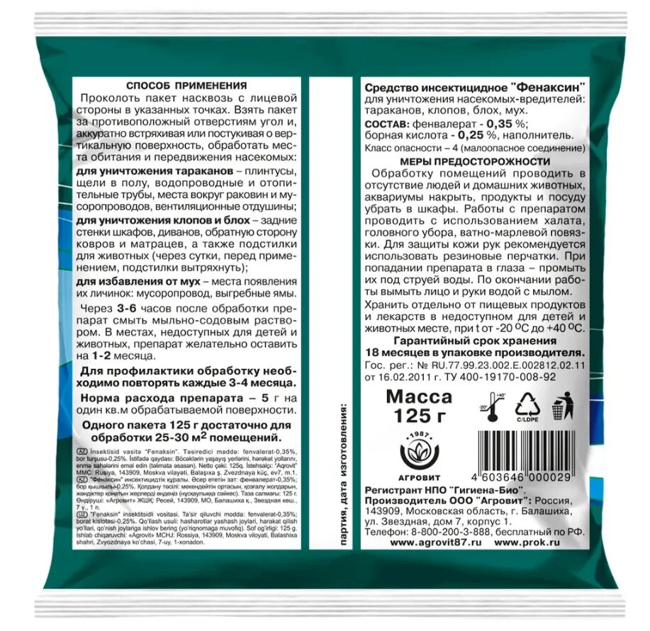 Комплект Средство Фенаксин от тараканов, клопов, блох, мух 125г, 5 штук + подарок информация: