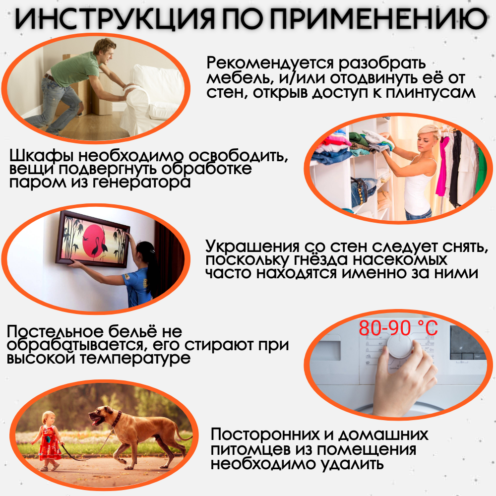 | Способ применения | Рабочий раствор готовится в соотношении 10 мл концентрата на 1 литр воды, при большой численности заряжения увеличивает соотношение до 20 мл на 1 литр. Для нанесения рабочей эмульсии используется распылитель, на места кладок яиц и скопления клопов наносить можно кистью. Если потребуется повторная обработка рекомендуется чередовать с другими препаратами, чтобы предотвратить привыкание клопов к препарату. Необходимо обработать: щели кроватей, диванов и низ мебели, швы матрасов, подушек, одеял, задняя сторона ковров, картин и бра, выдвижные полки прикроватных тумбочек и комодов, щели в плинтусах и радиаторы отопления, щели между обоями и отстающие их края, прикроватные выключатели и розетки (заранее обесточьте). Норма расхода готового раствора 100мл/1м2. |
