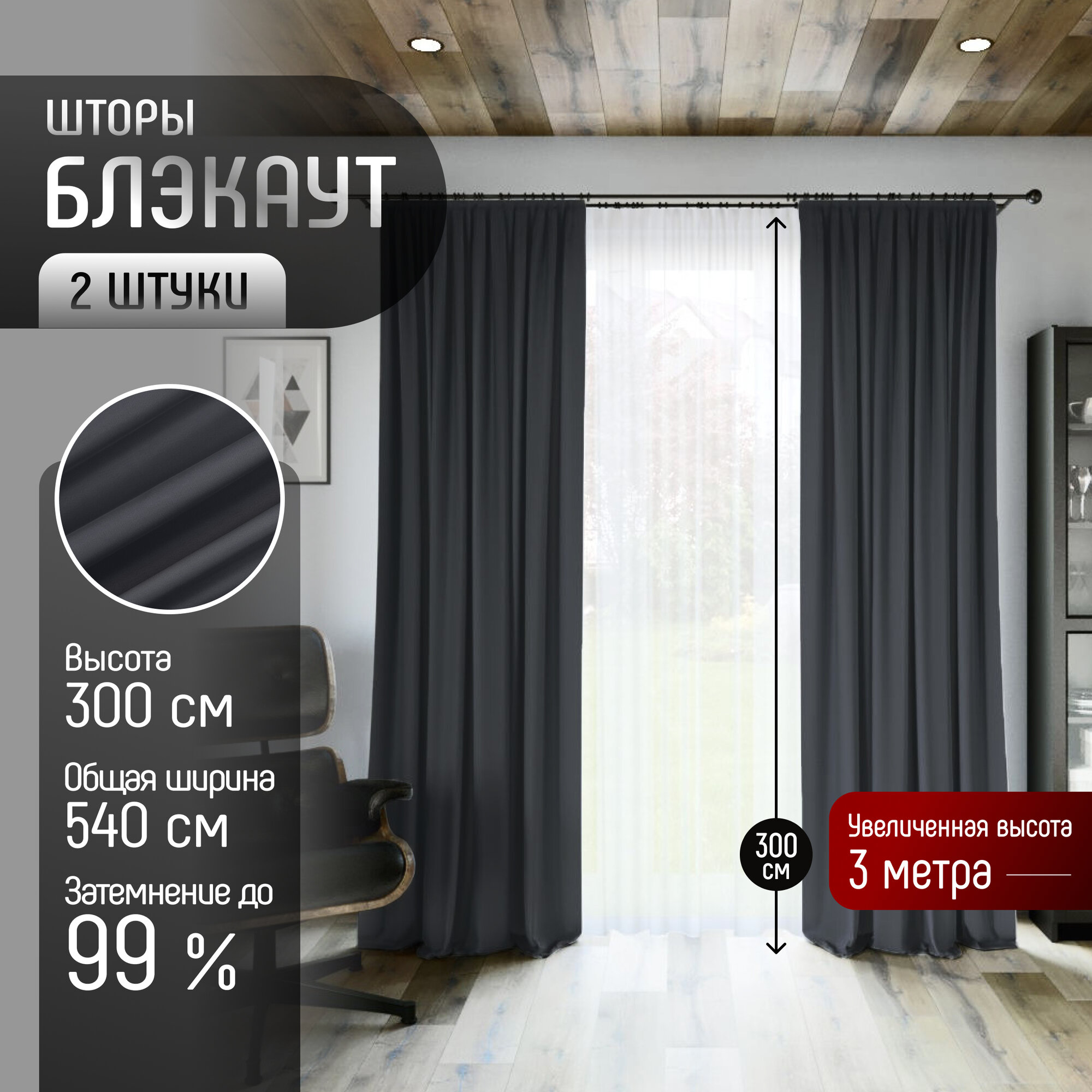 Комплект штор Блэкаут (2 шт.) высота 300 см, ткань Димаут, затемняющие шторы для спальни гостиной кухни детской, светонепроницаемость до 95% 5 119 ₽