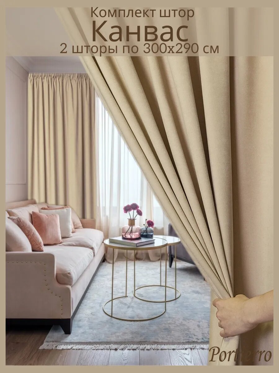Комплект матовых портьерных штор 300x290 см, 2 штуки, канвас, цвет: песочный 2 600 ₽