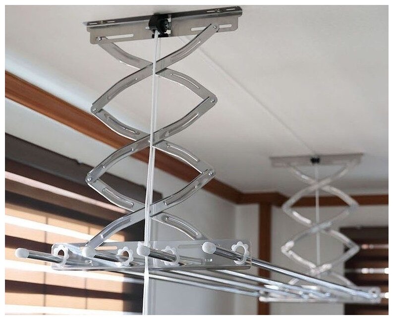 | Комплектация | сушилка, крепления, инструкция— 2 шт., дюбель и саморез — по 4 шт., инструкция на русском языке — 1 шт.; опускается от потолка на 100 cм., поднимается к потолку до 27 см.; регулирующая длина перекладин для белья от 103 -190 см |