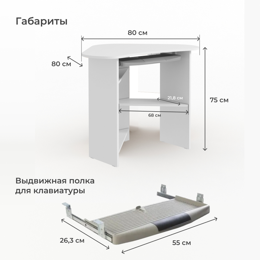 Стол компьютерный BONMEBEL, КС-800 угловой, белый + ПОЛОЧКА Д/КЛАВ, 80х80х75 см информация: