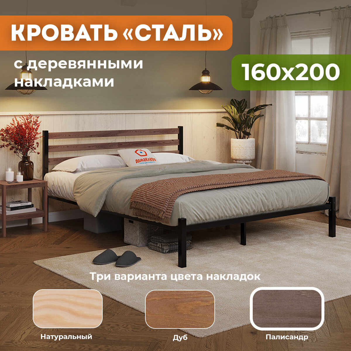Отзывы на Кровать металлическая Сталь с деревянными декоративными накладками на изголовье в цвете ПАЛИСАНДР 160х200, черная