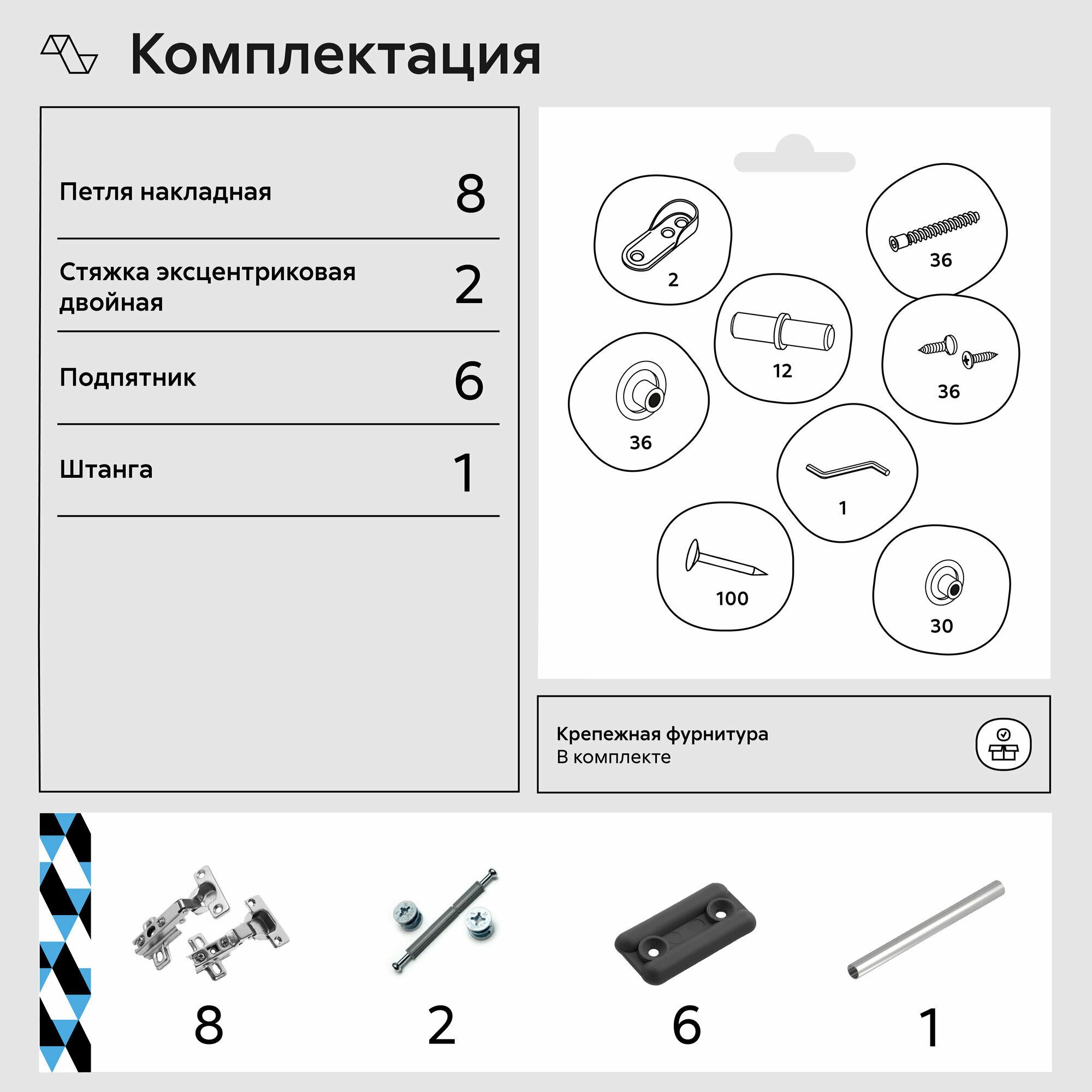 | Комплектация | Челси Шкаф 1200 (Ш) (Белый глянец холодный, белый) 120х211.6х51.4 см. Фурнитура, схема сборки |