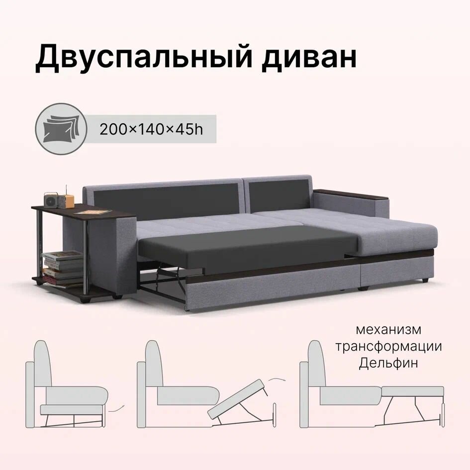Угловой диван-кровать Атланта Люкс, с ящиком для хранения, механизм дельфин, рогожка Malmo платина, 255х160х86 см, Много Мебели информация: