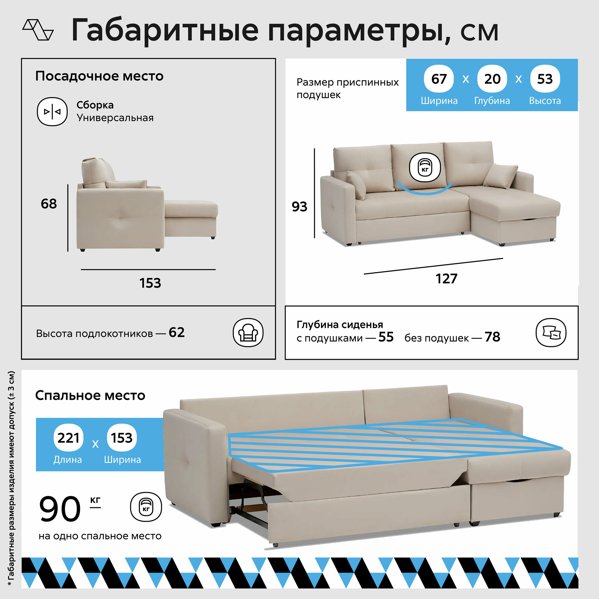 | Дополнительная информация | Глубина сиденья без подушек 78 см. Глубина сиденья с подушками 55 см. Высота без подушек 68 см. Высота подлокотников 61 см. Ширина посадочного места 127 см. Ширина подлокотника 12 см. Размер ящика для белья (ШхГхВ): 136х63х22 см. Размер в разложенном виде (ШхГхВ): 220х156х68 см. Размер приспинных подушек (ШхГхВ): 67х20х53 см. Чехол приспинных и декоративных подушек - съемный. |