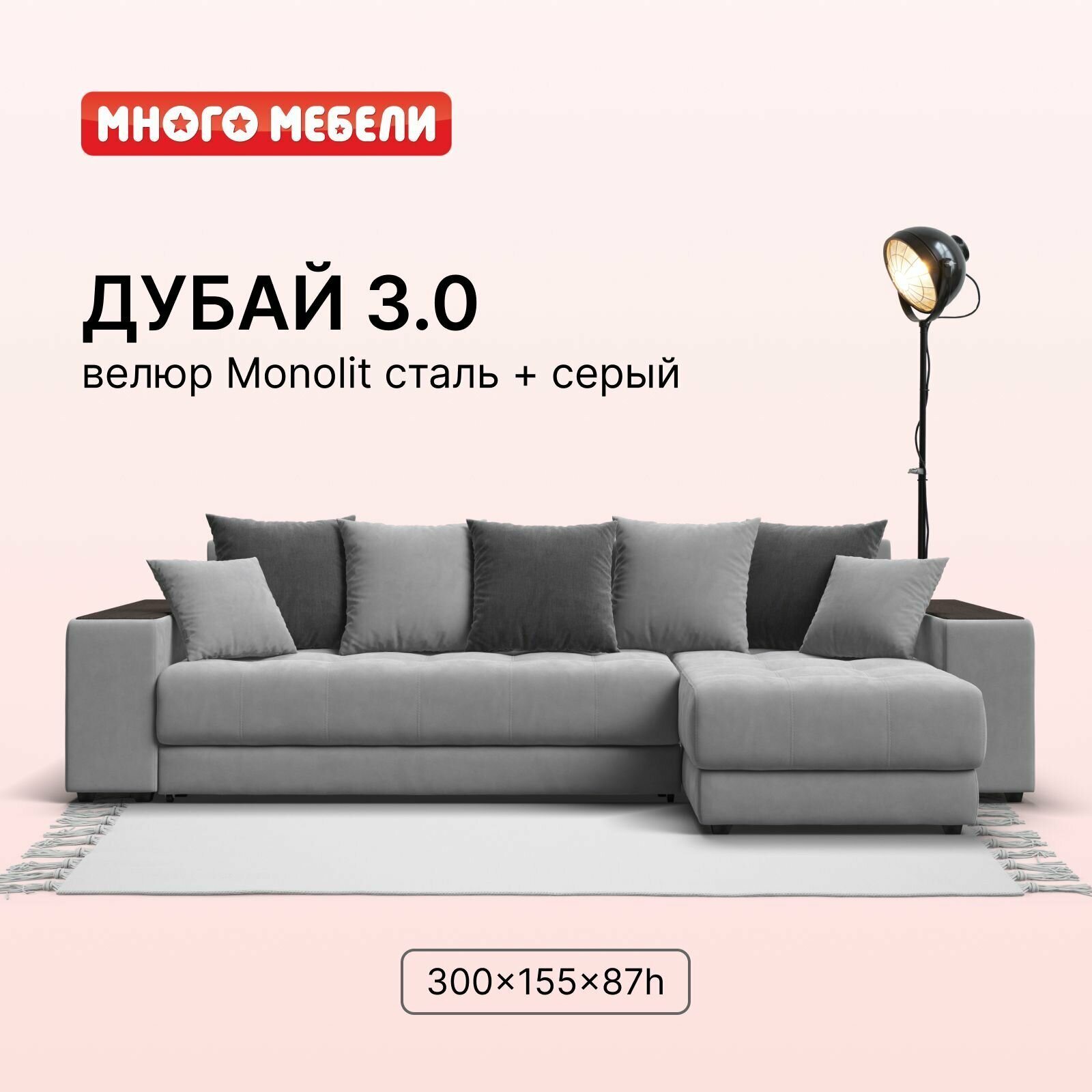 Угловой диван Много мебели Дубай 3.0, велюр Monolit серый/сталь, 300x155x87 см, НПБ 46 599 ₽