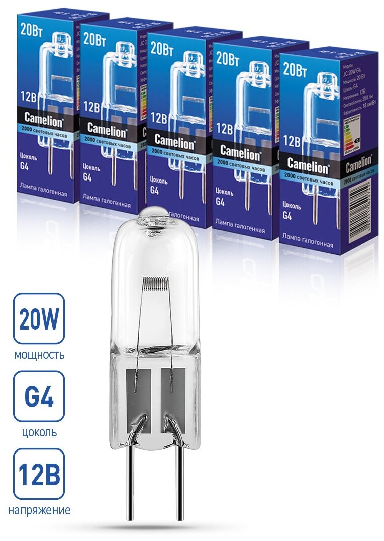 Галогеновые лампочки Camelion JC G4, мощность 20Вт, 12B, низковольтные, 5 штук в упаковке информация: