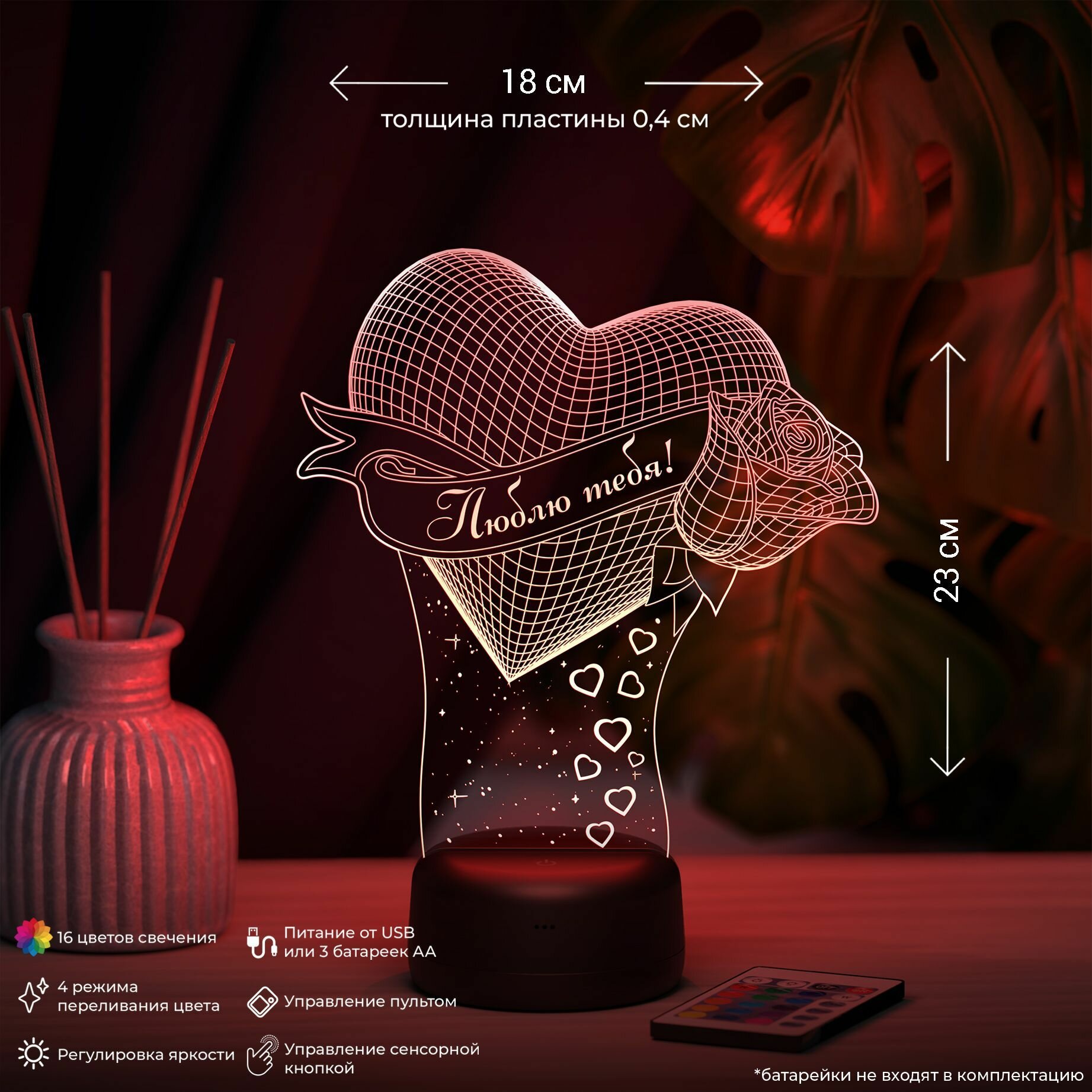 Ночник "Сердце с розой" - Люблю тебя, подарок любимой девушке, жене, мужу на 14 февраля информация: