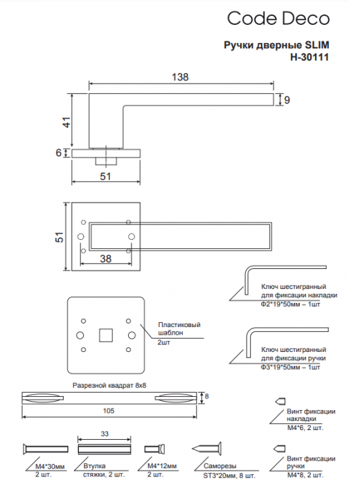 | Комплектация | Ручки дверные - 2шт, стяжки M4 12(33)30 - 2 шт, саморезы SТ3*20 - 8 шт, винт фиксации - 4 шт, ключ шестигранный - 2 шт. |