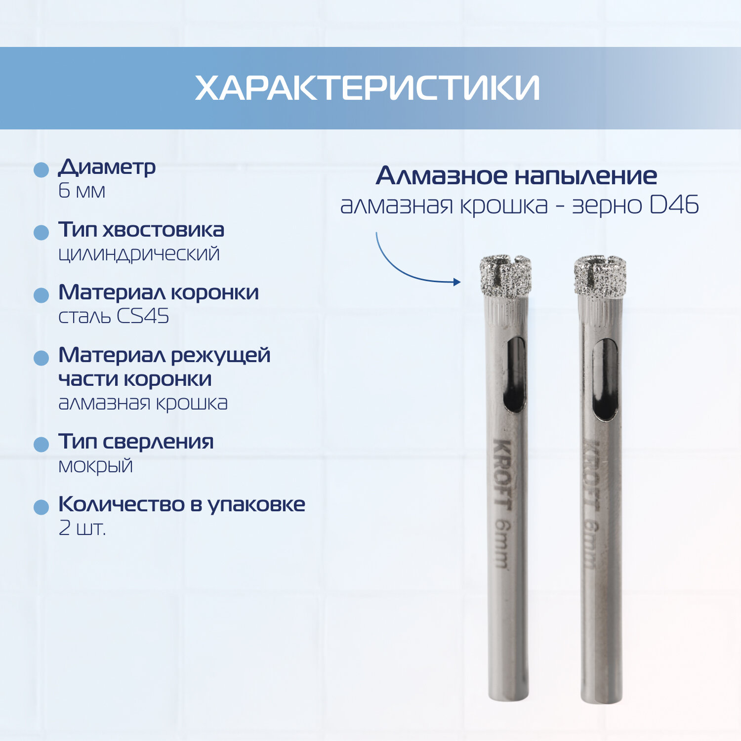 Коронка алмазная по керамике 6 мм 2 шт цилиндрический хвостовик KROFT информация:
