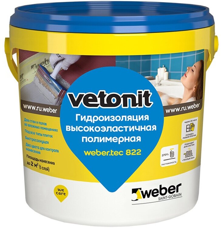 Vetonit Weber.tec 822, Гидроизоляция мастика для пола, гидропломба Ветонит Вебер 822, Готовая гидроизоляция в 2х цветах для контроля нанесения слоев