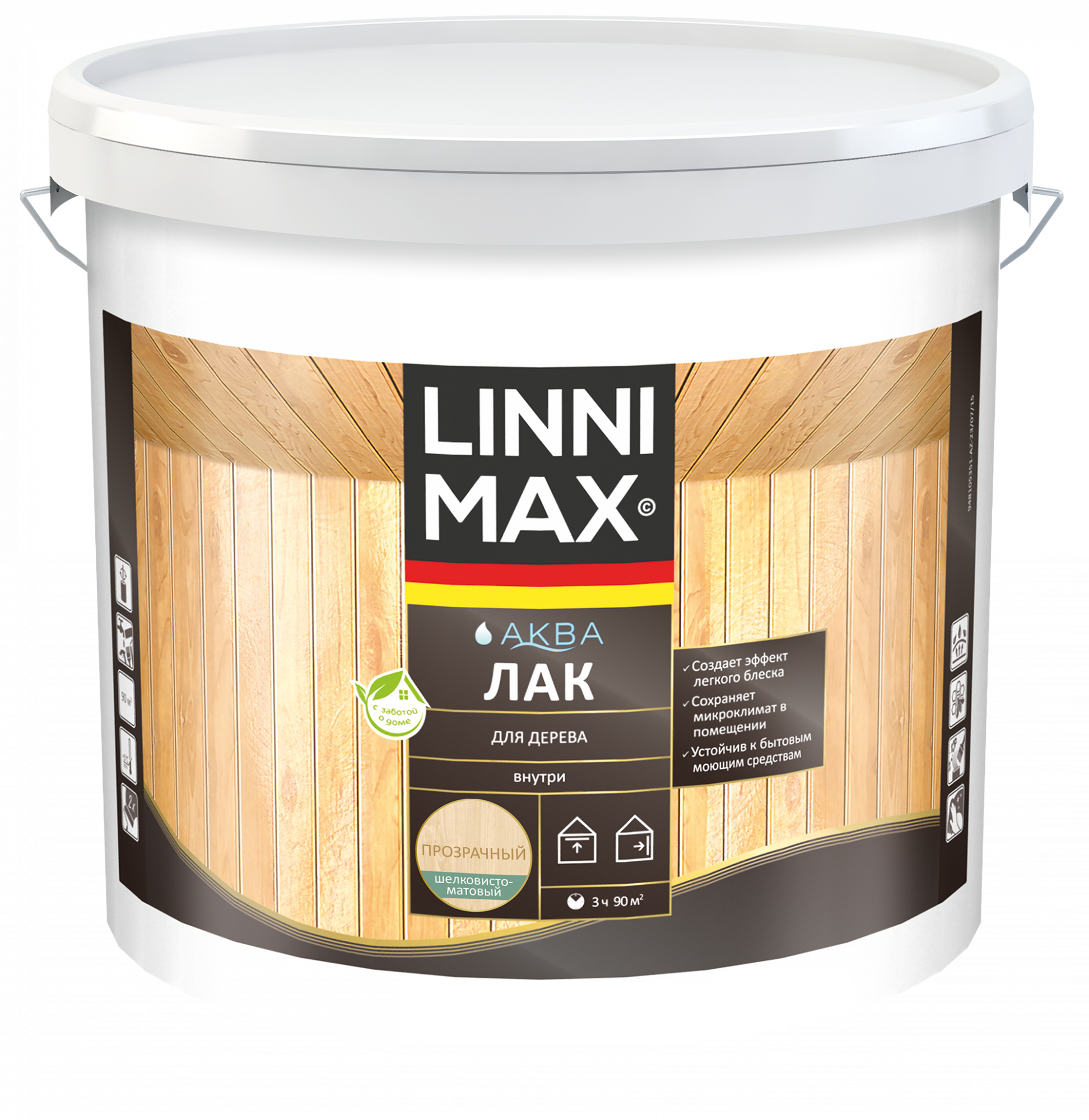 Лак LINNIMAX аква акриловый для дерева для внутренних работ, шелковисто-матовый, прозрачный 9л информация:
