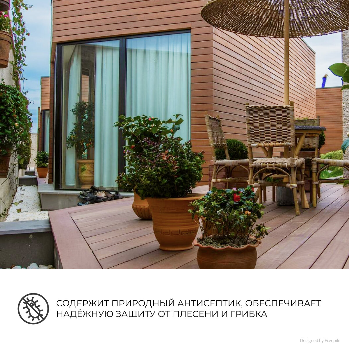 | Дополнительная информация | Состав: смесь натуральных масел (льняное, тунговое), эфир канифоли, микровоск, УФ-фильтр и термостабилизатор, антисептики, уайт-спирит, ускорители сушки, реологические и другие функциональные добавки; Расход: 50 - 120 г/м²; Способ нанесения: кисть, валик, хлопчатобумажная ткань; Количество слоев: 2 - 3; Время высыхания одного слоя: 24 ч; Время полного высыхания: 48 ч; Температура применения: от +5 °С; |