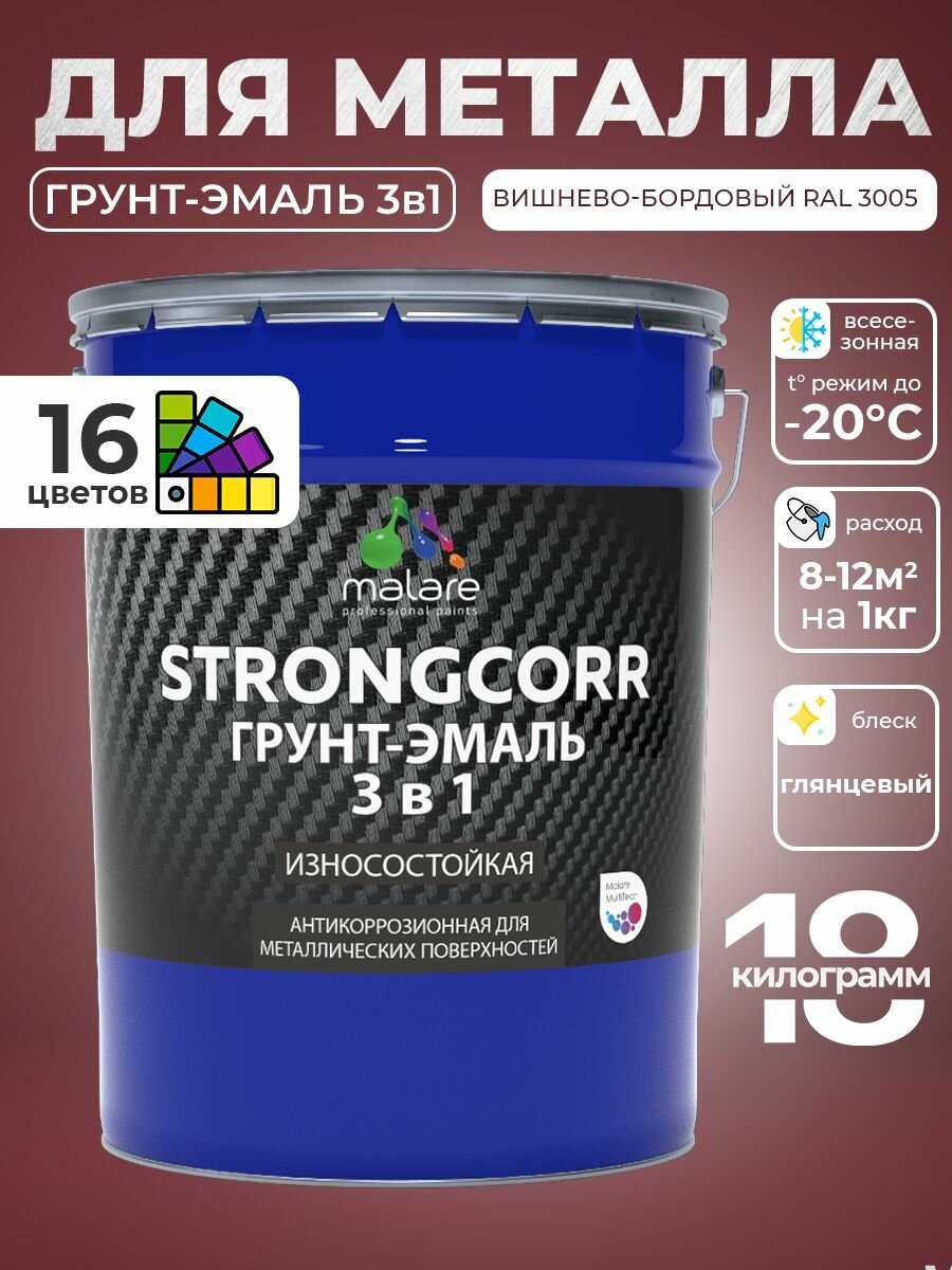 10 цен на Грунт-Эмаль Malare 3 в 1 для металлических поверхностей, краска для металла, износостойкая, глянцевая, RAL 3005, вишнево-бордовый, 18 кг.