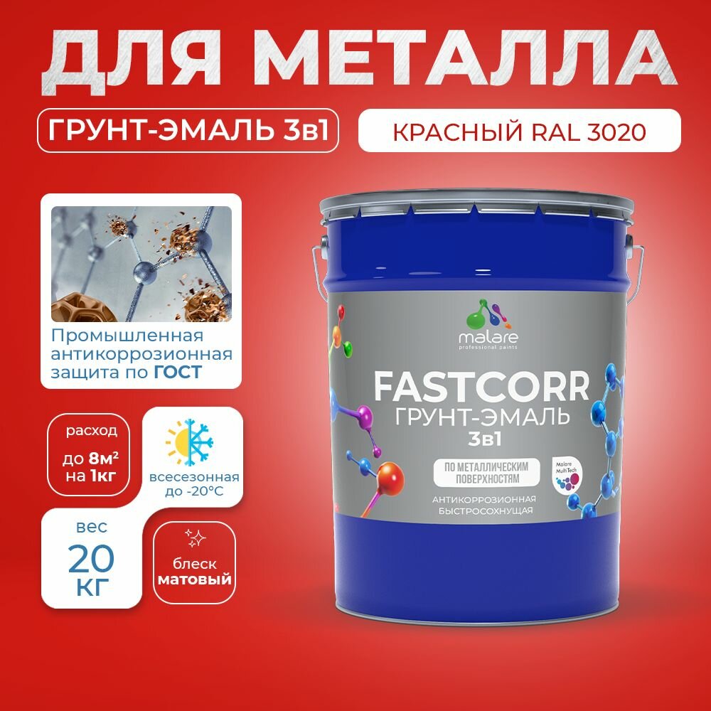 Грунт-эмаль по ржавчине 3 в 1 Malare FastCorr краска для металла, антикоррозионная износостойкая быстросохнущая RAL 3020, красный, матовая, 20 кг. информация: