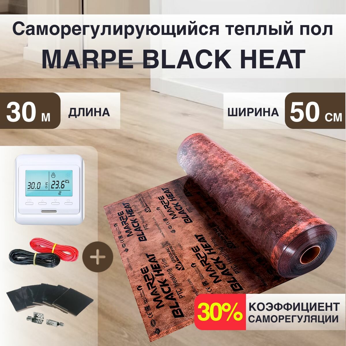 Саморегулирующийся инфракрасный теплый пол 3 м.кв. MARPE Black Heat 50 см ширина, комплект элит с терморегулятором 10 100 ₽