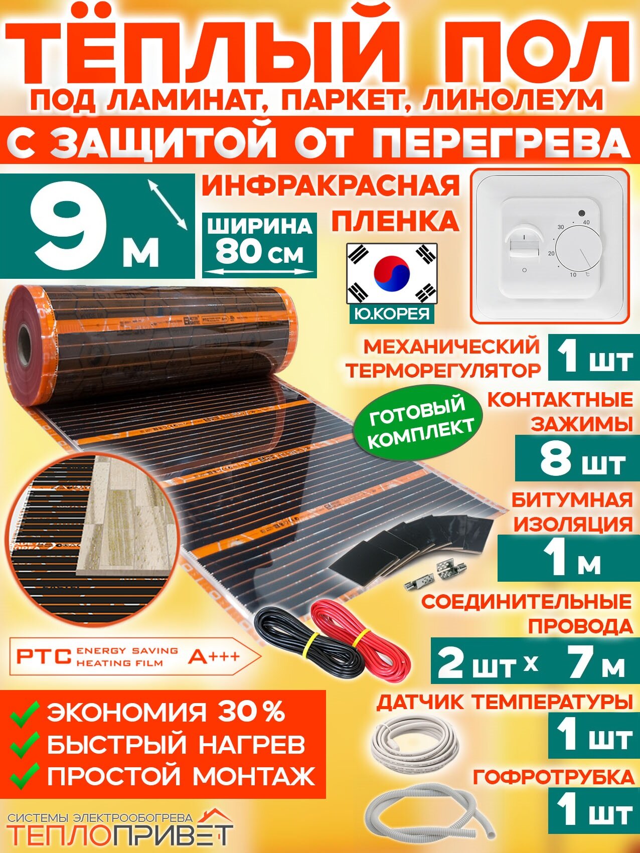 Инфракрасный теплый пол Eastec PTC 9 м х 80 см 1584 Вт комплект саморегулирующий TLS-80-9 + механический терморегулятор информация: