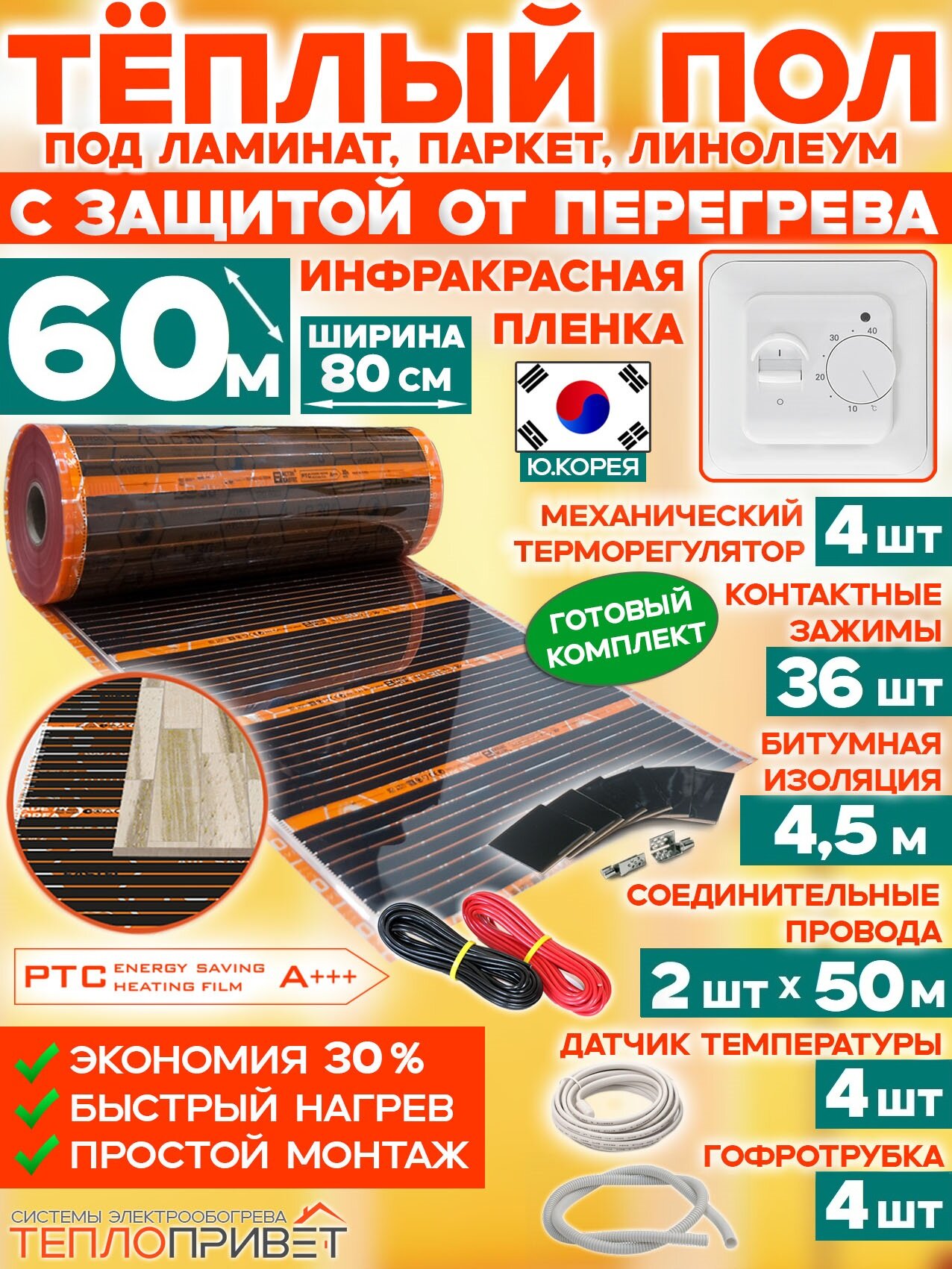 Инфракрасный теплый пол Eastec PTC 60 м х 80 см 10560 Вт комплект саморегул. TLS-80-60 + механический терморегулятор информация: