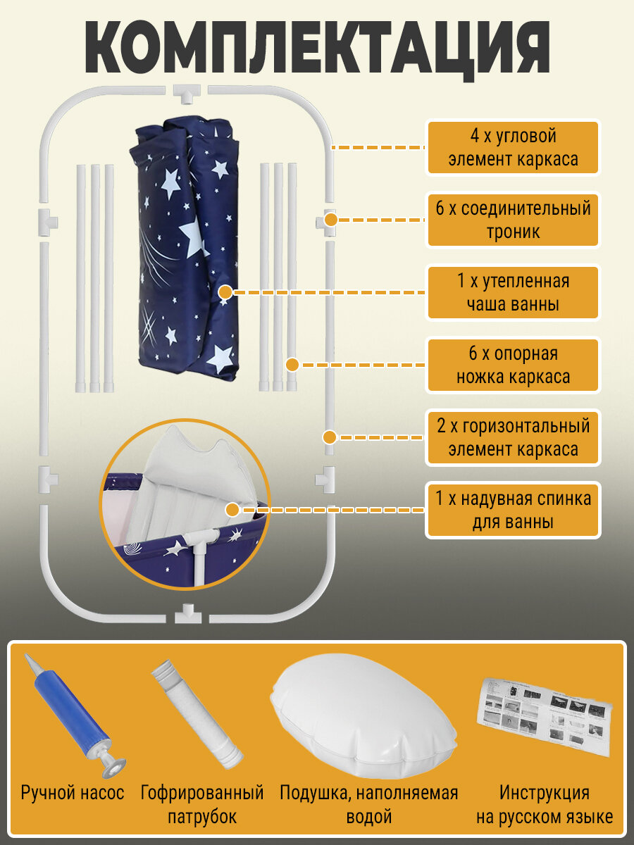| Дополнительная информация | ванна не требует сборки, поставляется в сборе со складным каркасом; ванна снабжена боковым и донным клапаном для слива воды; рекомендуемый объем наполнения чаши - 2/3 от высоты бортика |