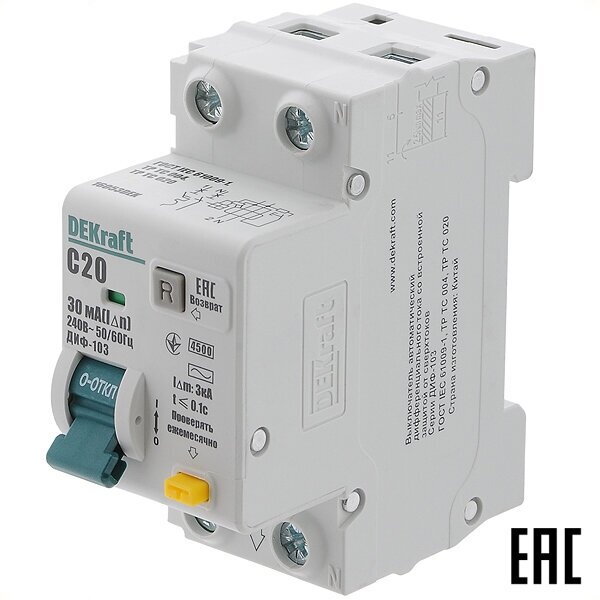 АВДТ 1P+N 20A 30mA тип AC х-ка C 4,5kA ДИФ-103 DEKraft информация: