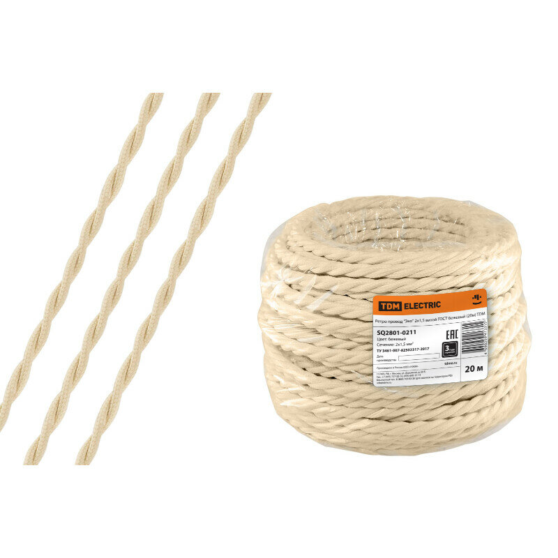 (20 м) Ретро провод TDM Эко 2х1,5 ГОСТ, витой, бежевый информация: