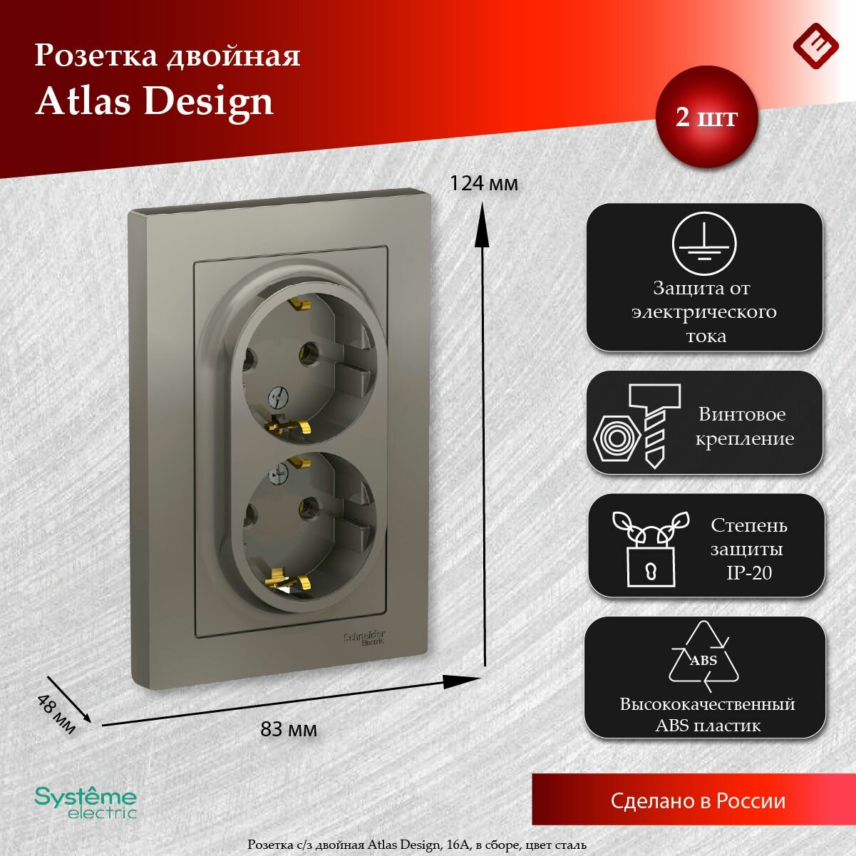 Розетка двойная сталь, с заземлением,16А, в сборе, Schneider Electric AtlasDesign (комплект 2шт) информация: