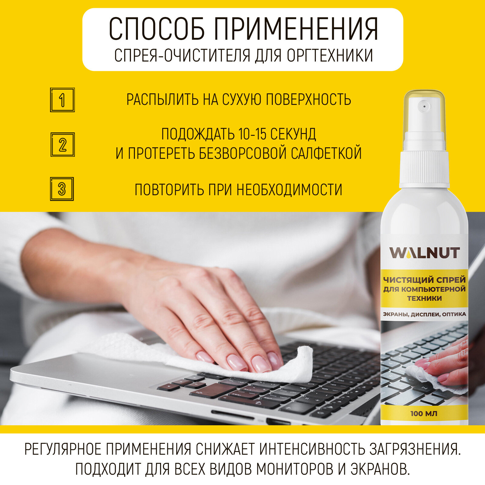 Спрей для мониторов компьютеров и ноутбуков WALNUT, без разводов, 100 мл информация: