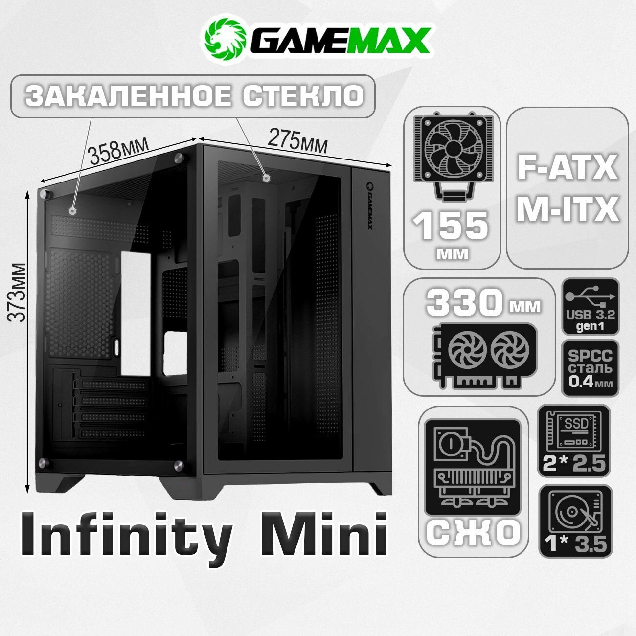Корпус для ПК GameMax Infinity Mini Black (Черный Mini-Tower CPU 155мм VGA 330мм Закаленное стекло, 1*USB 3.0, 2*USB 2.0) информация: