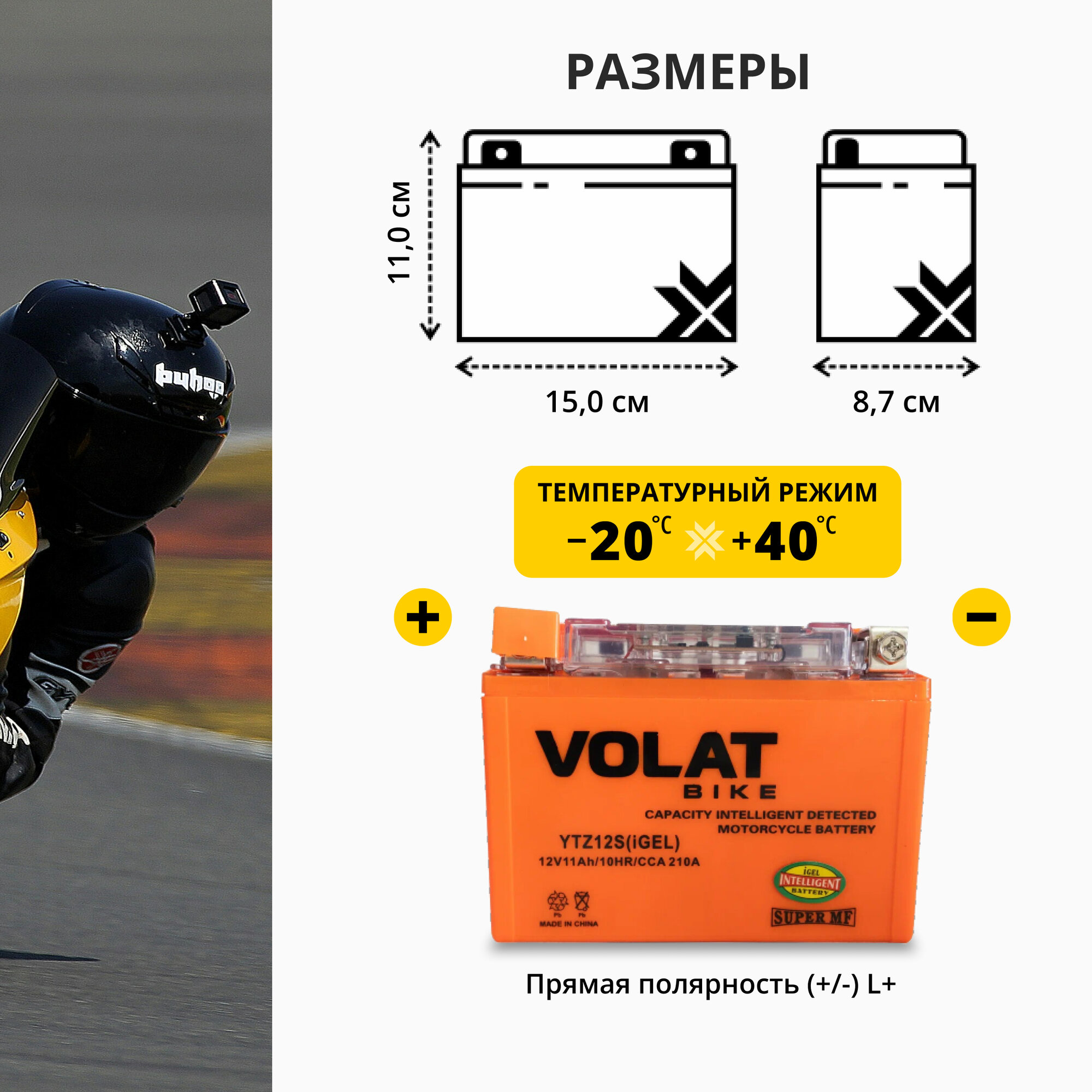 Отзывы на Аккумулятор для мотоцикла 12v Volat YTZ12S(iGEL) прямая полярность 11 Ah 210 A гелевый, акб на скутер, мопед, квадроцикл, мотоцикл