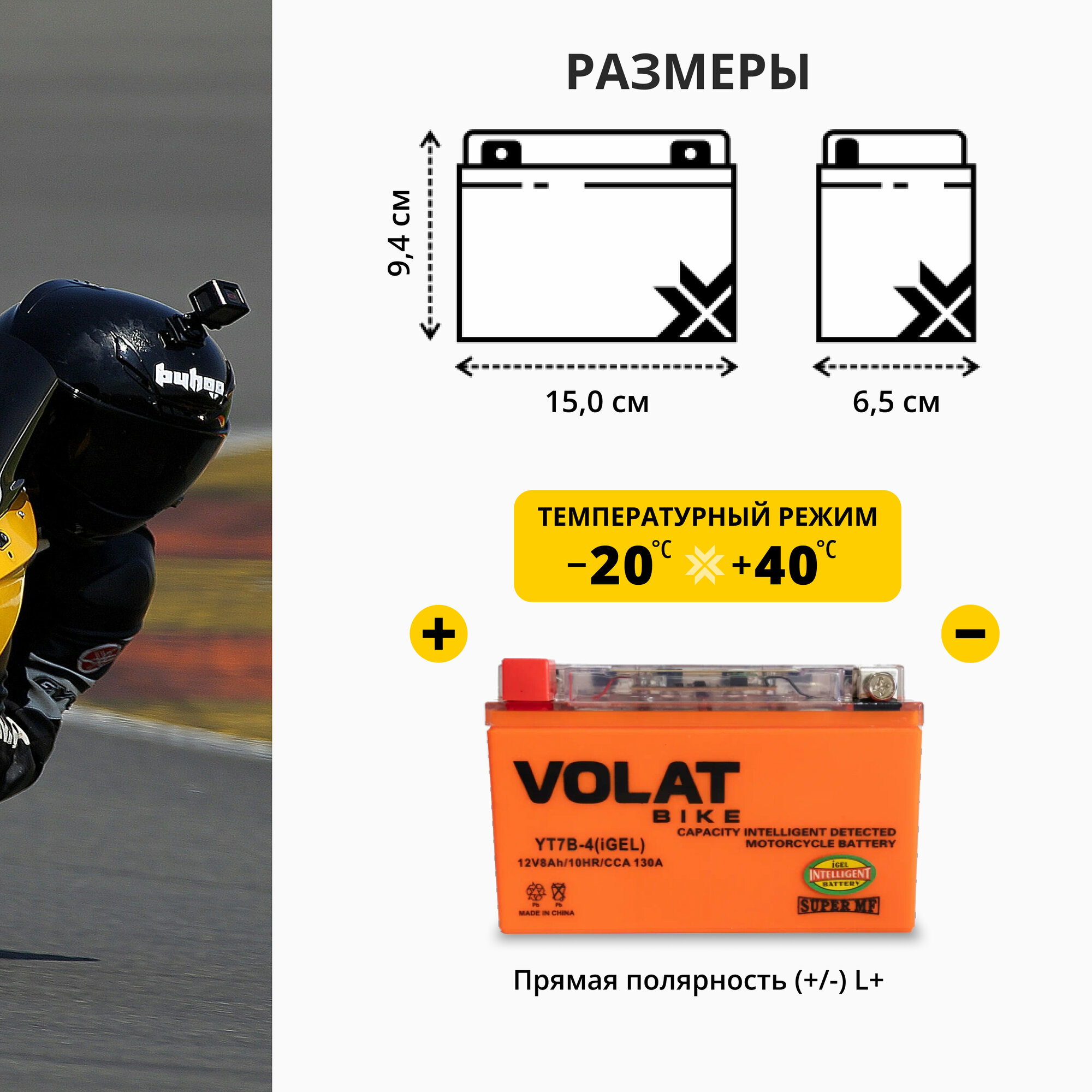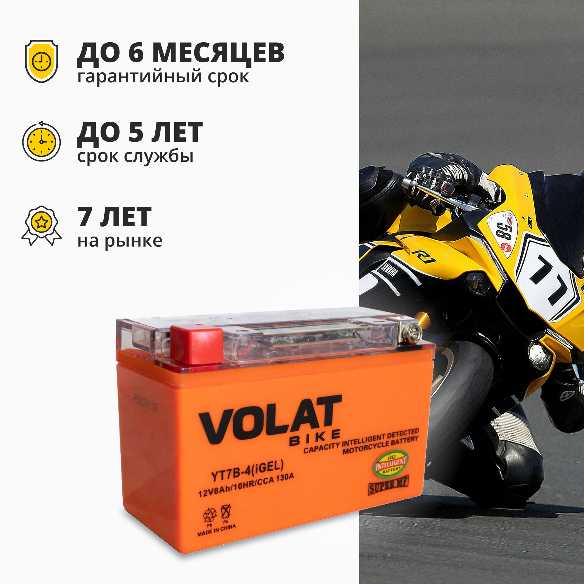 Отзывы на Аккумулятор для мотоцикла 12v Volat YT7B-4(iGEL) прямая полярность 8 Ah 130 A гелевый, акб на скутер, мопед, квадроцикл, мотоцикл