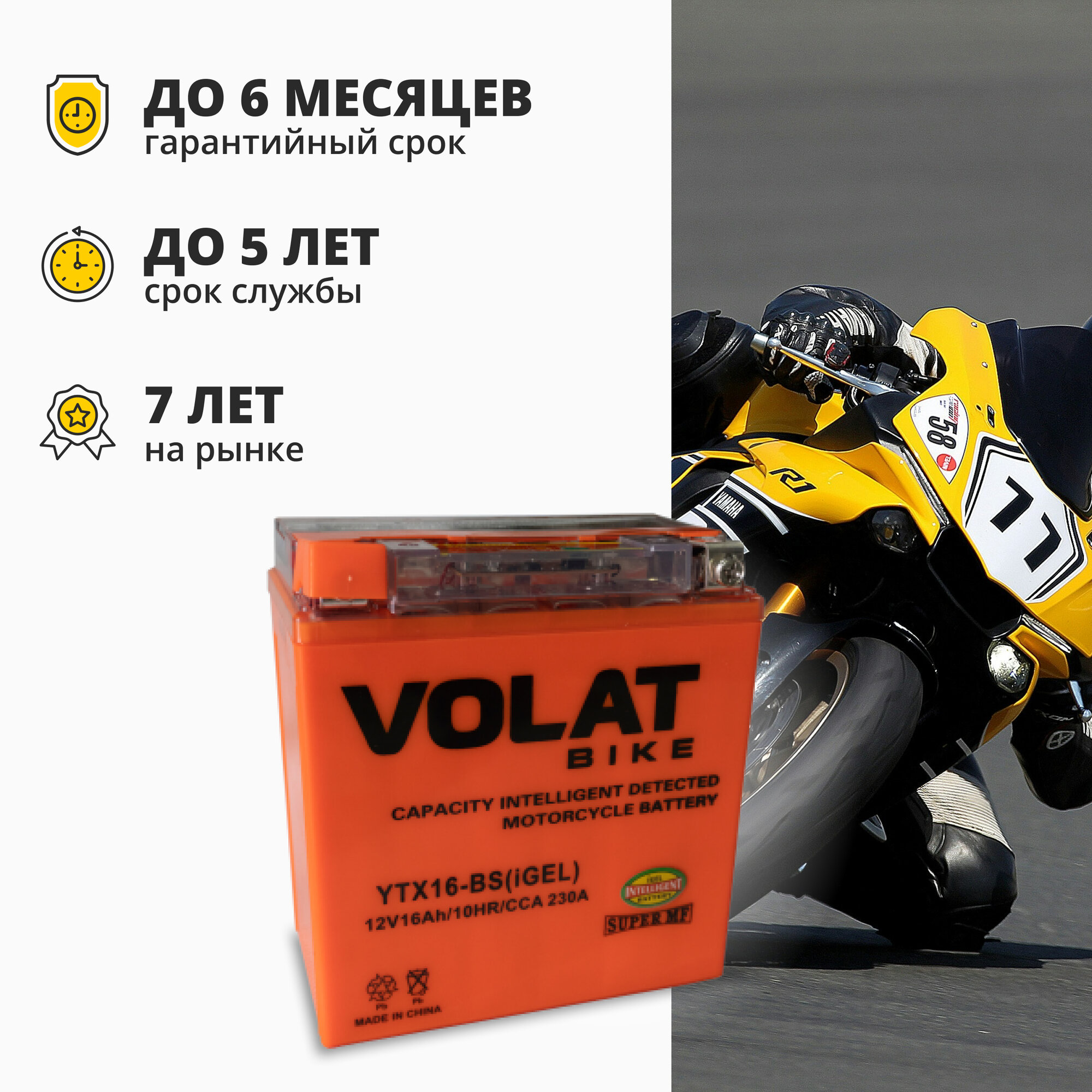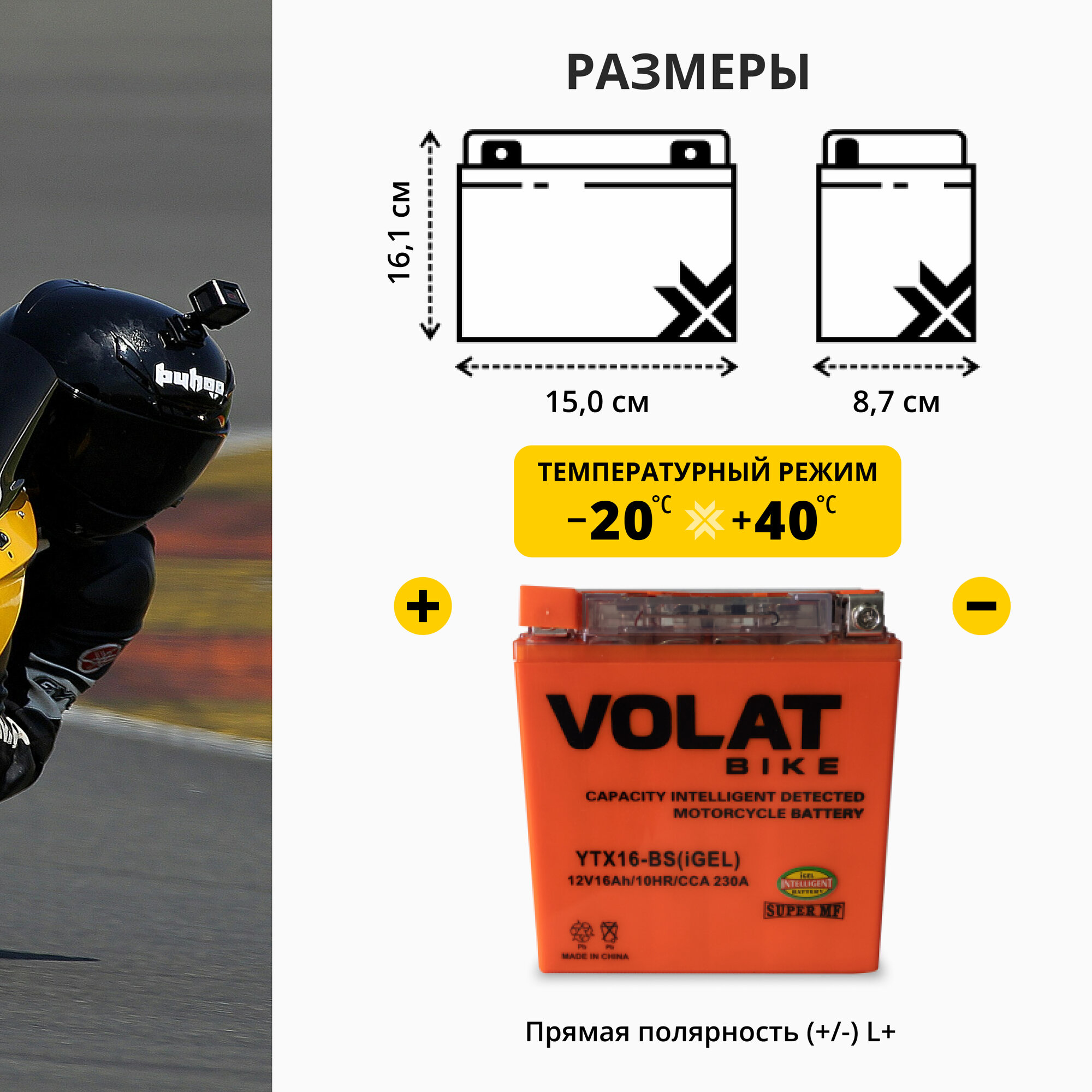 Отзывы на Аккумулятор для мотоцикла 12v Volat YTX16-BS(iGEL) прямая полярность 16 Ah 230 A гелевый, акб на скутер, мопед, квадроцикл, мотоцикл