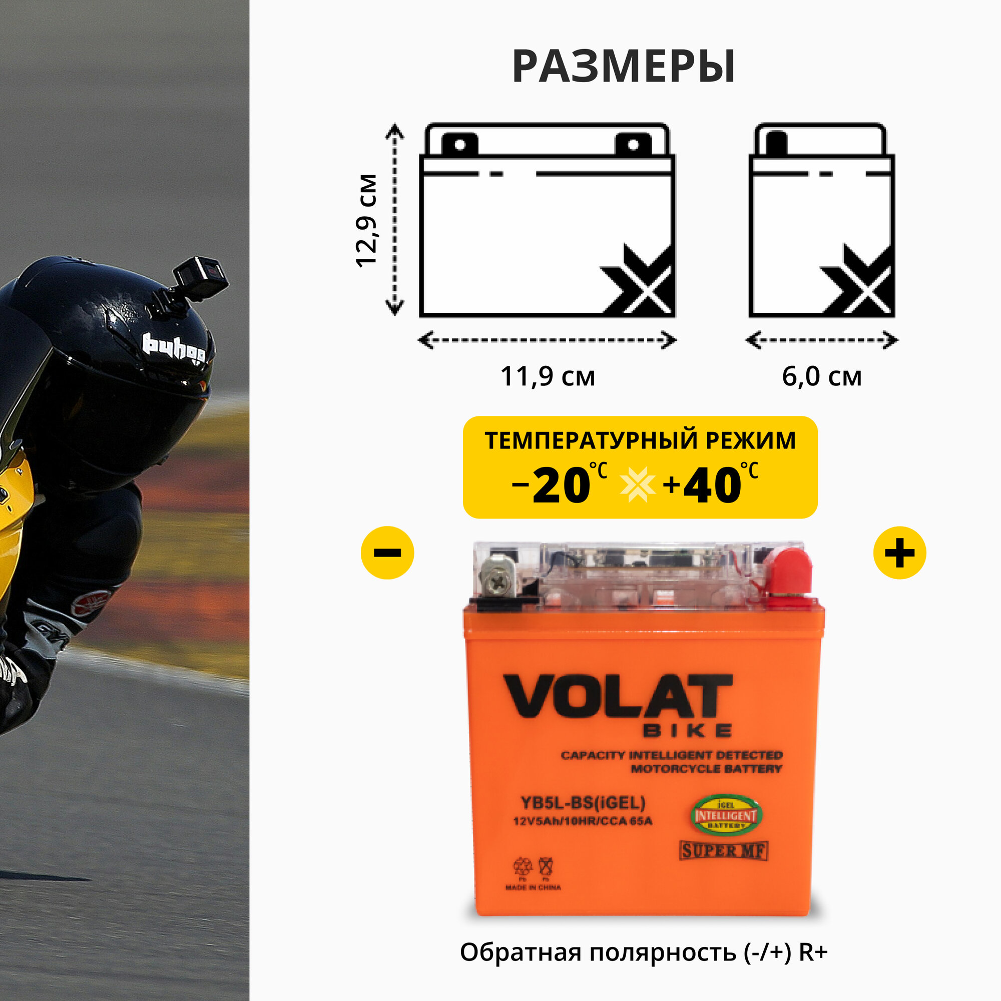 Отзывы на Аккумулятор для мотоцикла 12v Volat YB5L-BS(iGEL) обратная полярность 5 Ah 65 A гелевый, акб на скутер, мопед, квадроцикл, мотоцикл