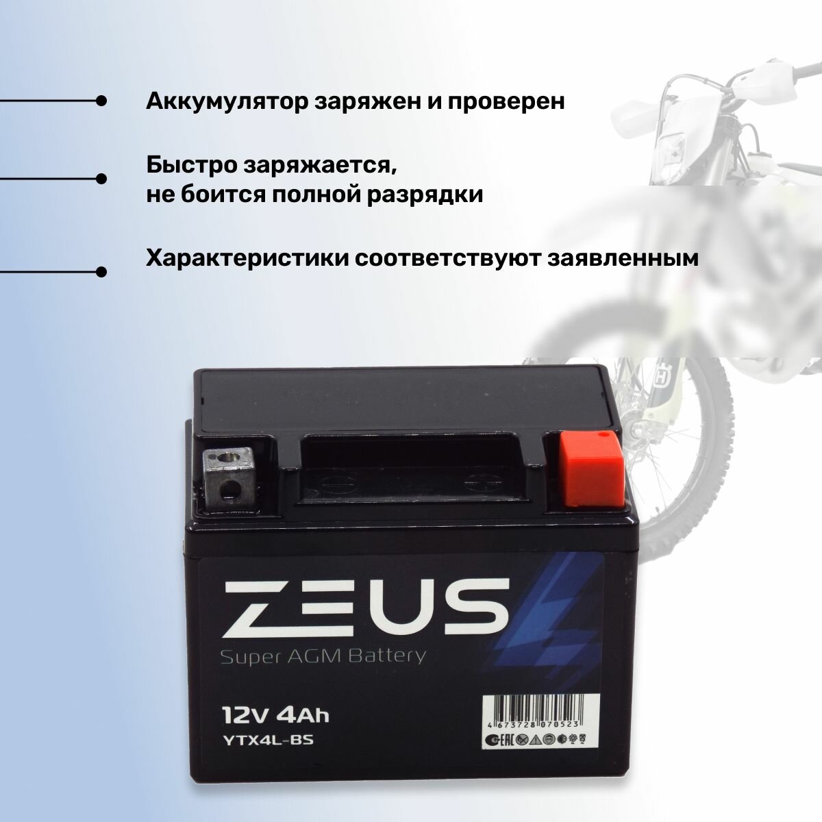 Отзывы на Аккумулятор стартерный AGM для мотоцикла/квадроцикла/скутера ZEUS SUPER AGM YTX4L-BS (12V/4Ah) (UTX4L-BS, СТ 1204)