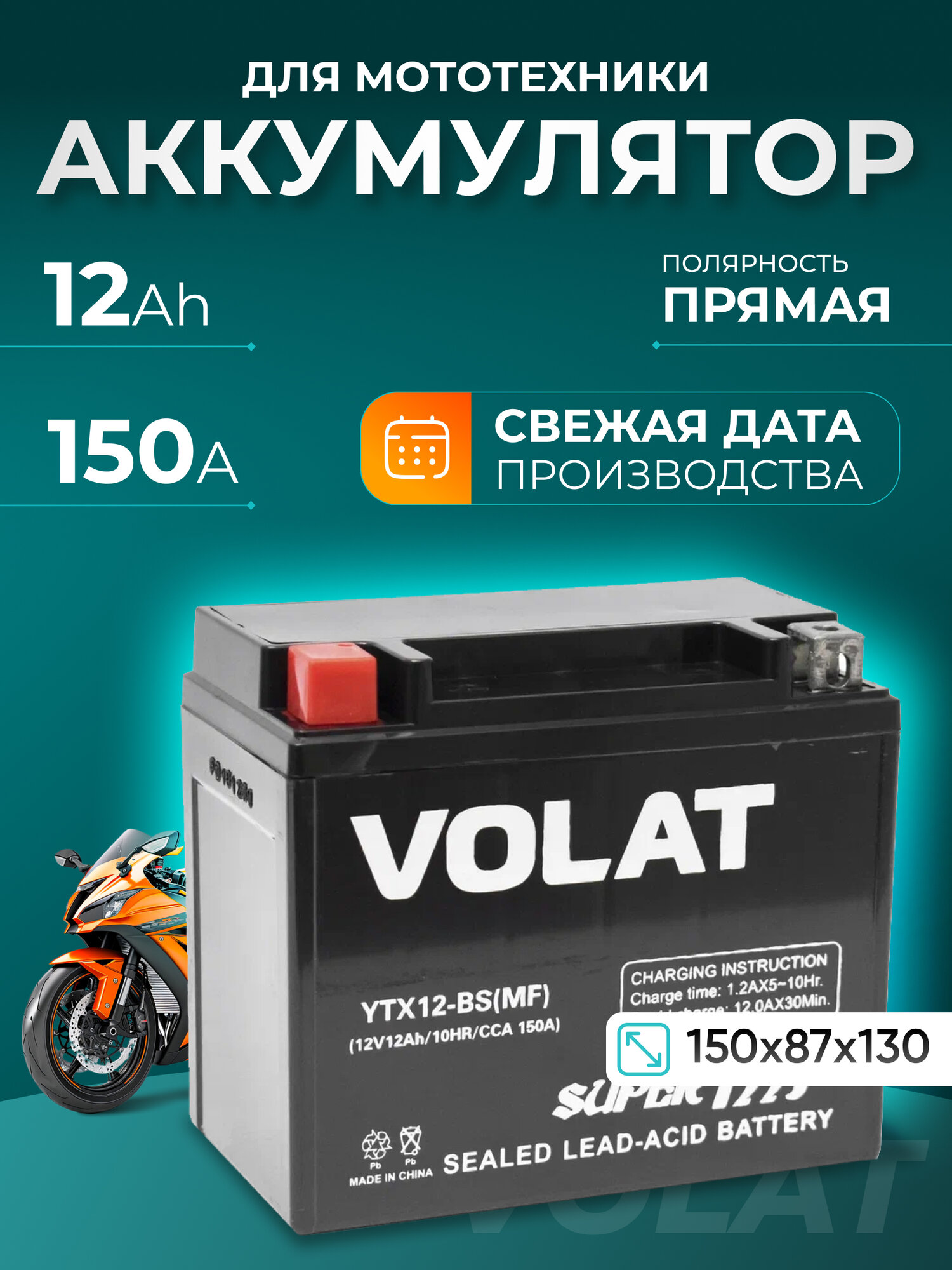 Отзывы на Аккумулятор для мотоцикла 12v Volat YTX12-BS(MF) прямая полярность 12 Ah 150 A AGM, акб на скутер, мопед, квадроцикл, мотоцикл