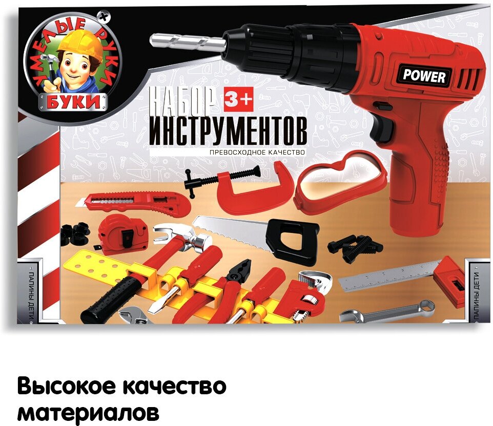 Комплектация | дрель-шуруповерт с насадками на батарейках, маска, разводной ключ, отвертка со сменными головками, молоток, штангенциркуль, строительный нож, болты с гайками, трафареты и аксессуары для игры с набором инструментов |