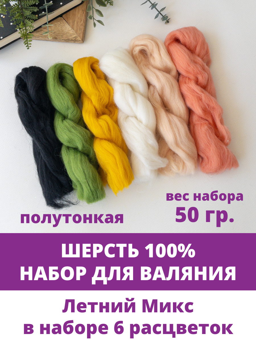 10 цен на Шерсть для валяния, состав шерсть 100%, 50 гр, набор 6 цветов - Летние цвета