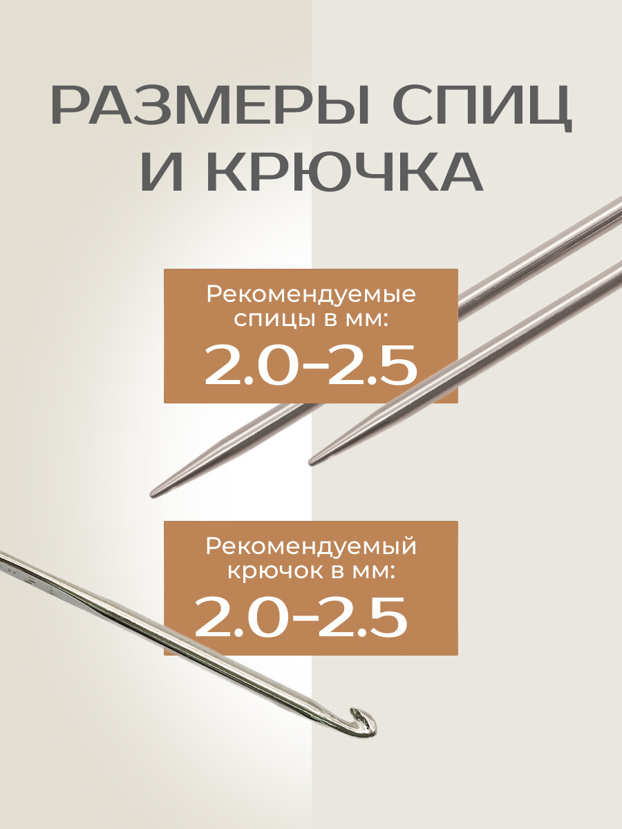 | Рекомендуемый размер спиц | 1.5 мм, 1.6 мм, 1.7 мм, 1.75 мм, 2 мм, 2.25 мм, 2.5 мм, 2.75 мм, 3 мм, 3.25 мм, 3.5 мм, 3.75 мм, 4 мм |