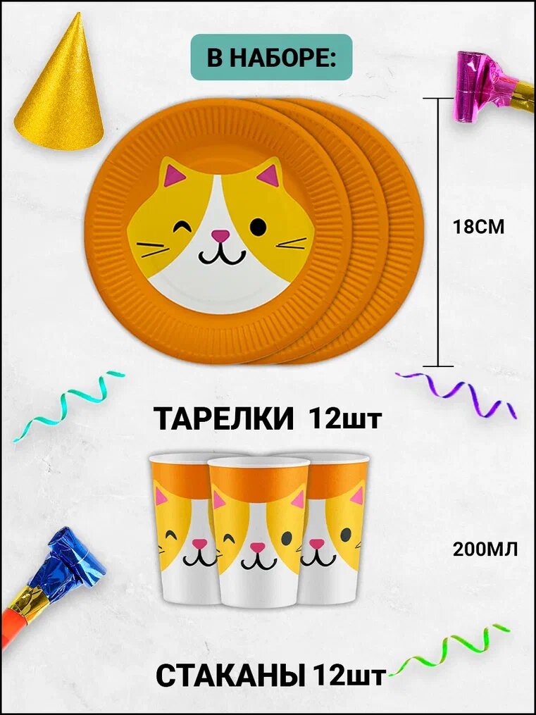 Одноразовая посуда для праздника CLEANLY, разовые бумажные тарелки 18см и стаканы 200мл, праздничный набор на 12 персон информация: