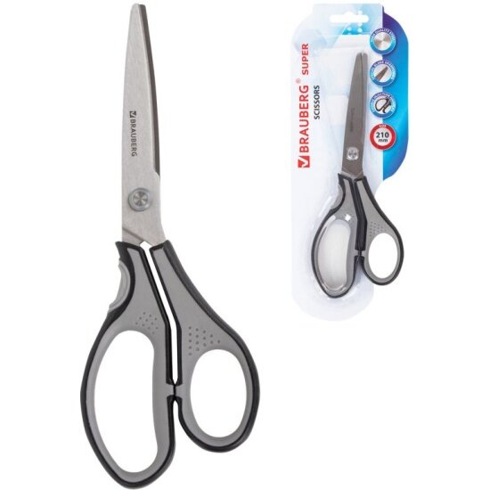 Ножницы BRAUBERG "SUPER", 210 мм, серо-черные, 2-х сторонняя заточка, эргономичные ручки, 237296