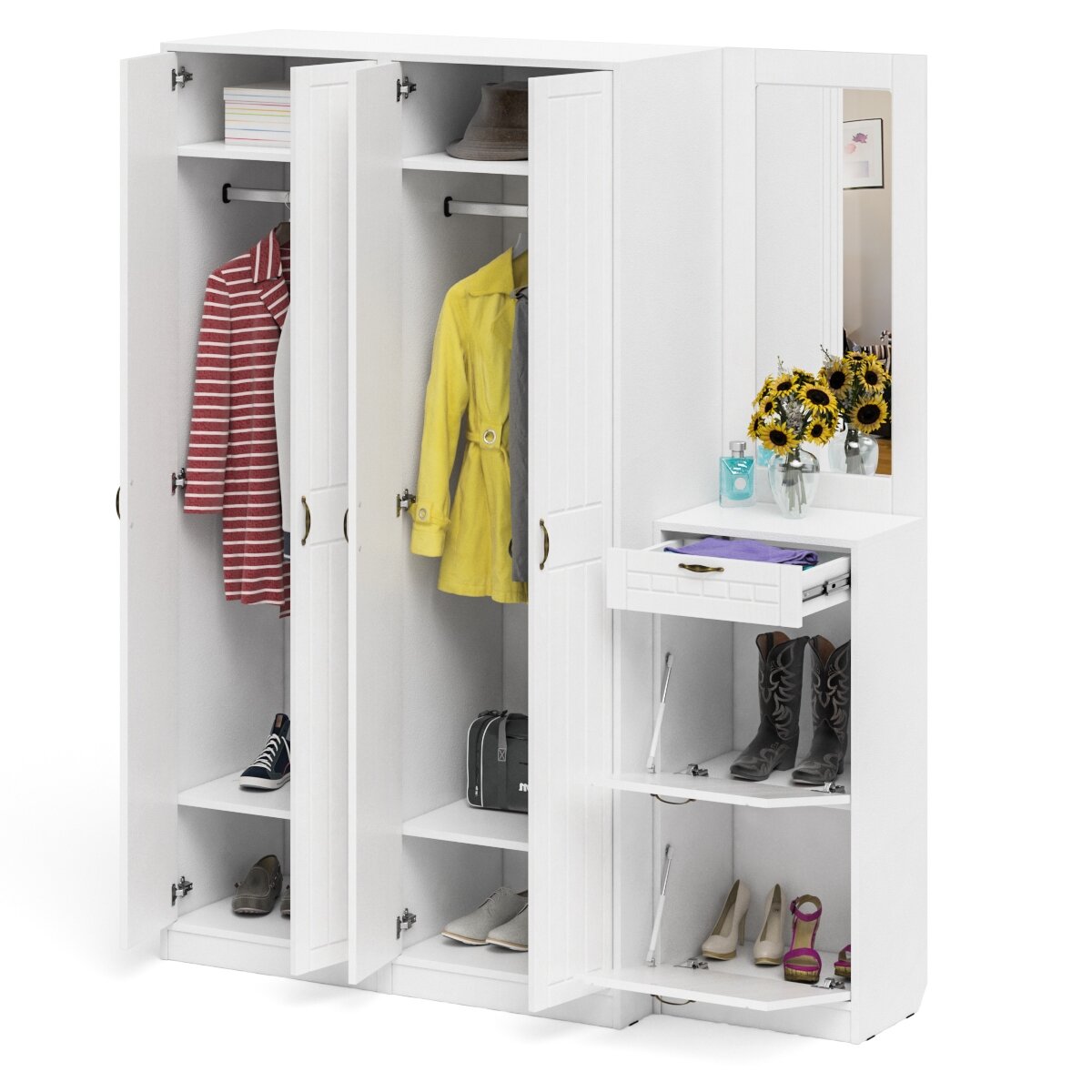 | Состав комплекта | состоит из двух шкафов для одежды объединенных в единый блок / высокой обувницы и навесного зеркала |