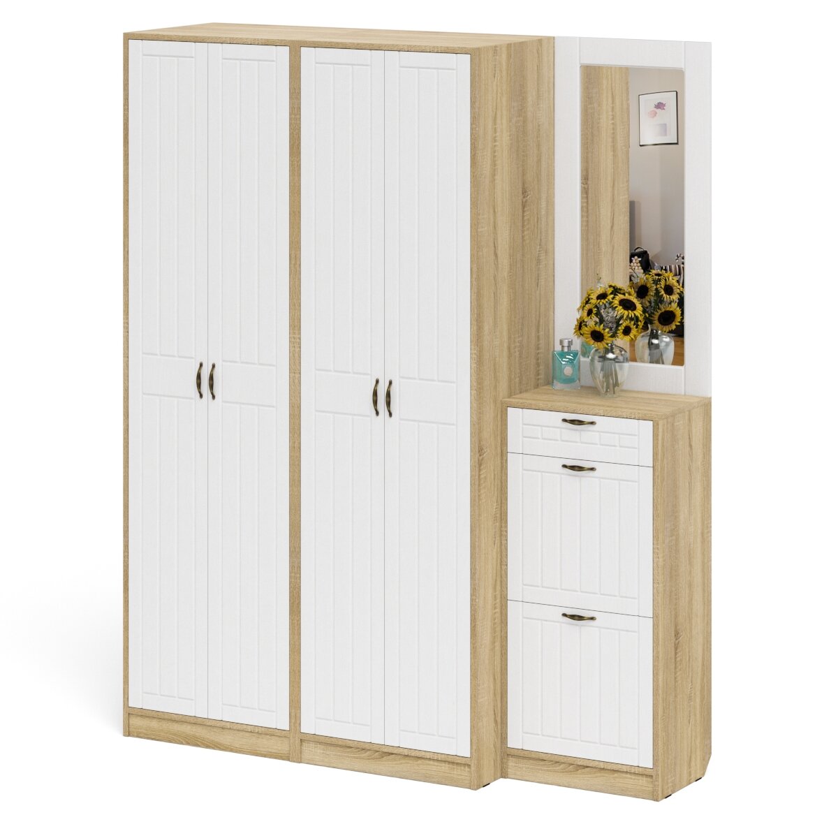 | Состав комплекта | состоит из двух шкафов для одежды объединенных в единый блок / высокой обувницы и навесного зеркала |