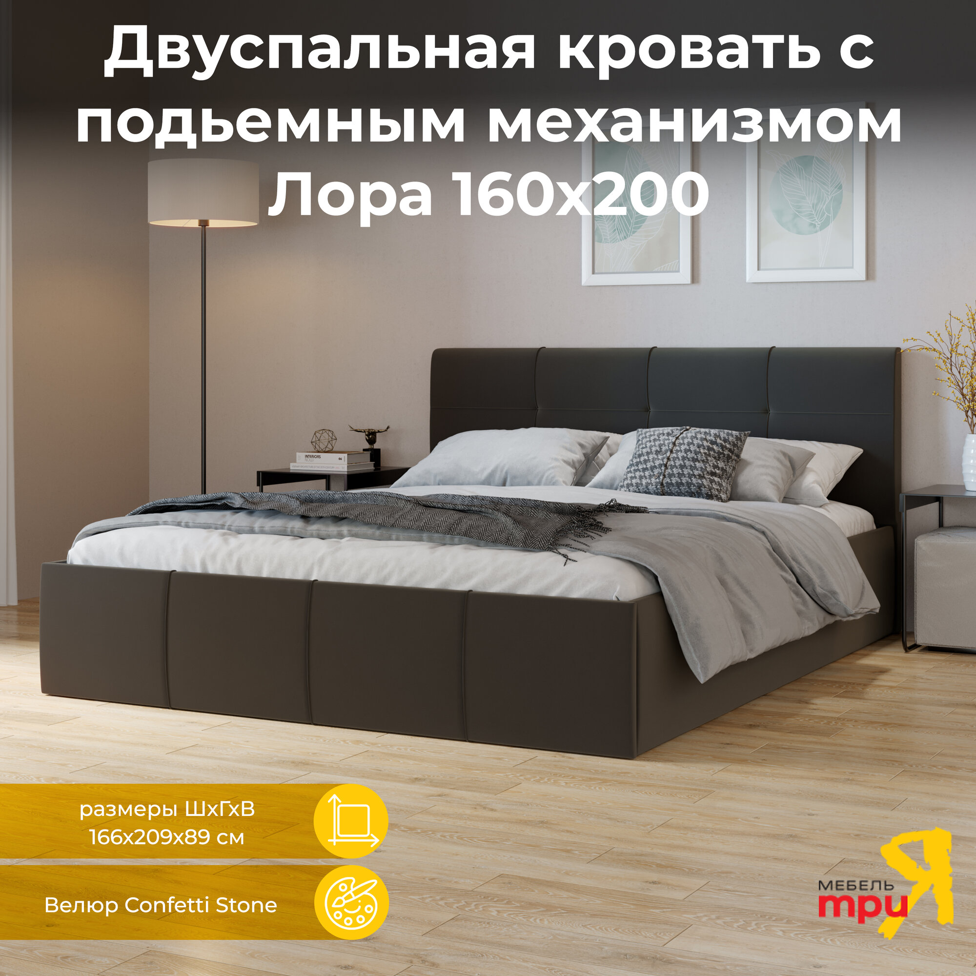 Кровать с подъемным механизмом, с мягкой обивкой и заглушиной коричневая 160х200 Лора Велюр Confetti Stone 23 999 ₽